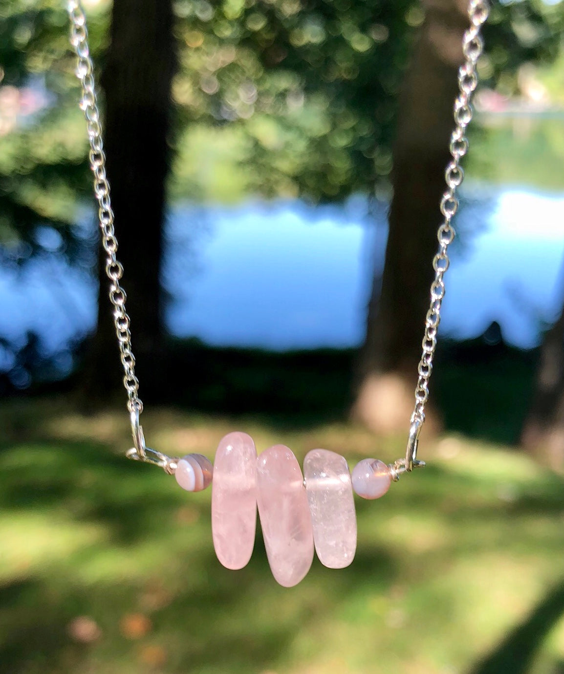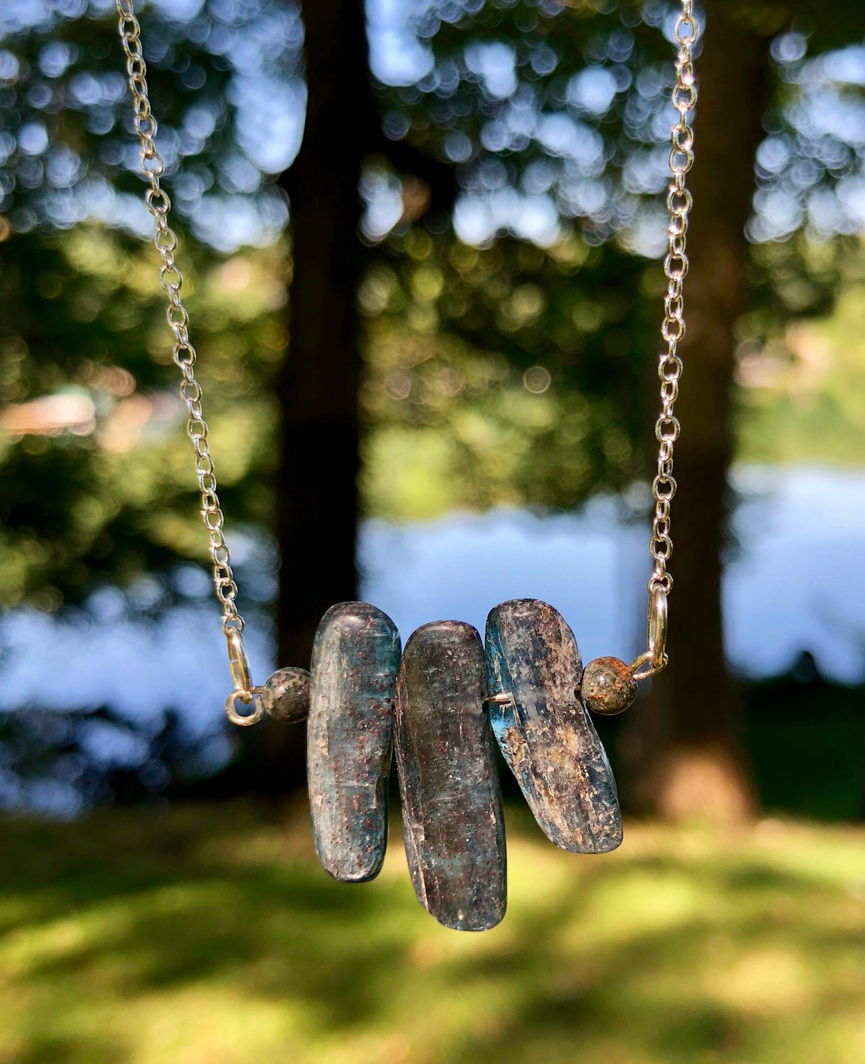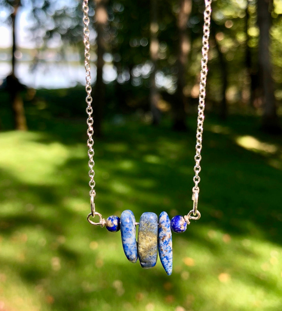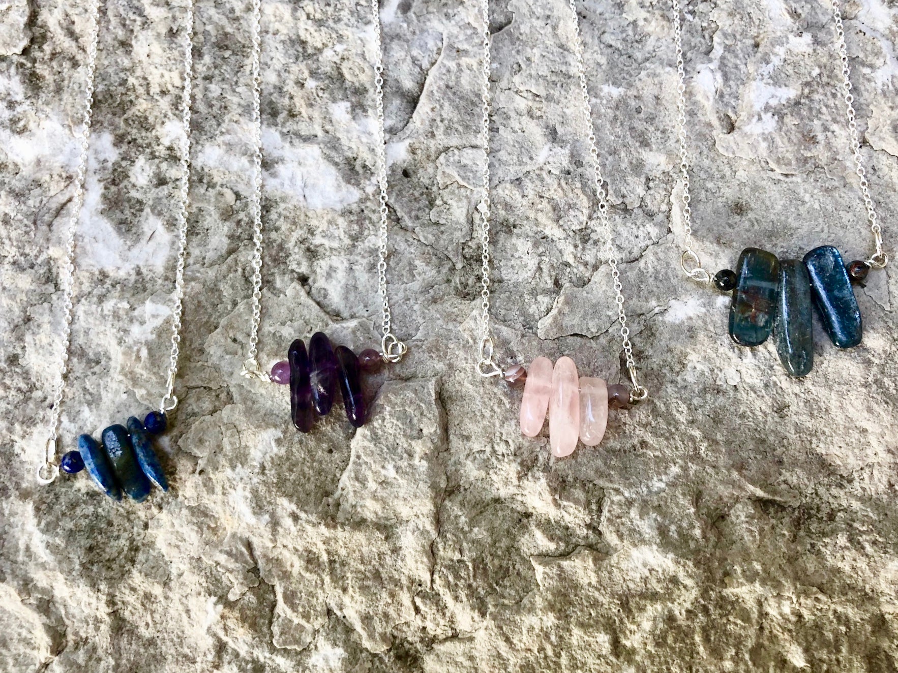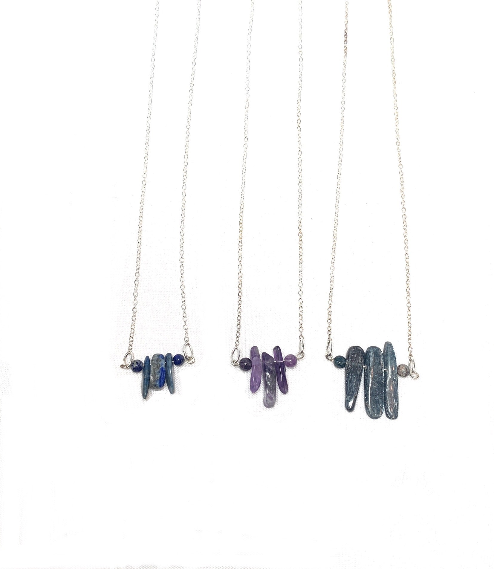 Set claim and mark your own intention with our handmade Cairn gemstone necklace.  Exclusively designed and handcrafted by Positively Me Boutique.  Choose from lapis lazuli, amethyst, rose quartz or kyanite stones stacked on a sterling silver 18” chain.