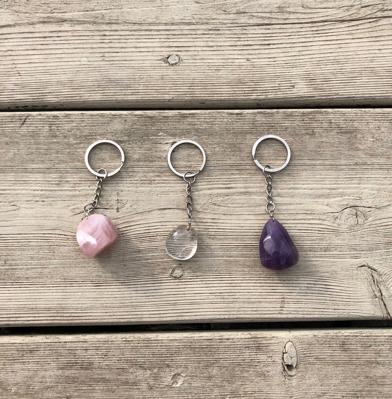 Always have your crystal with you as a keychain or purse charm. Choose from Rose Quartz, Clear Quartz or Amethyst.