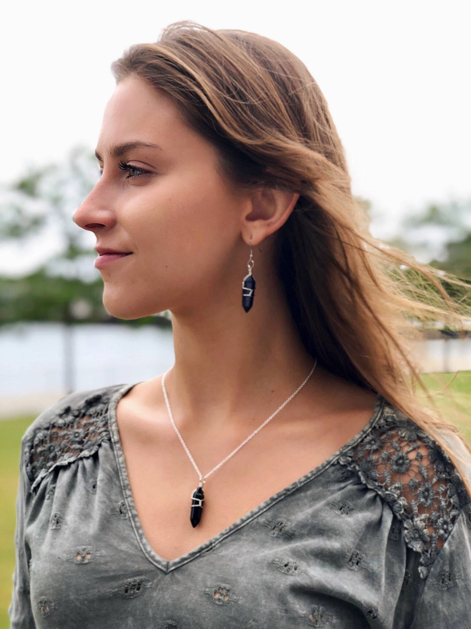 Model is wearing our Healing Crystal Point Earrings and Necklace in Black Agate. Matching necklaces sold separately.