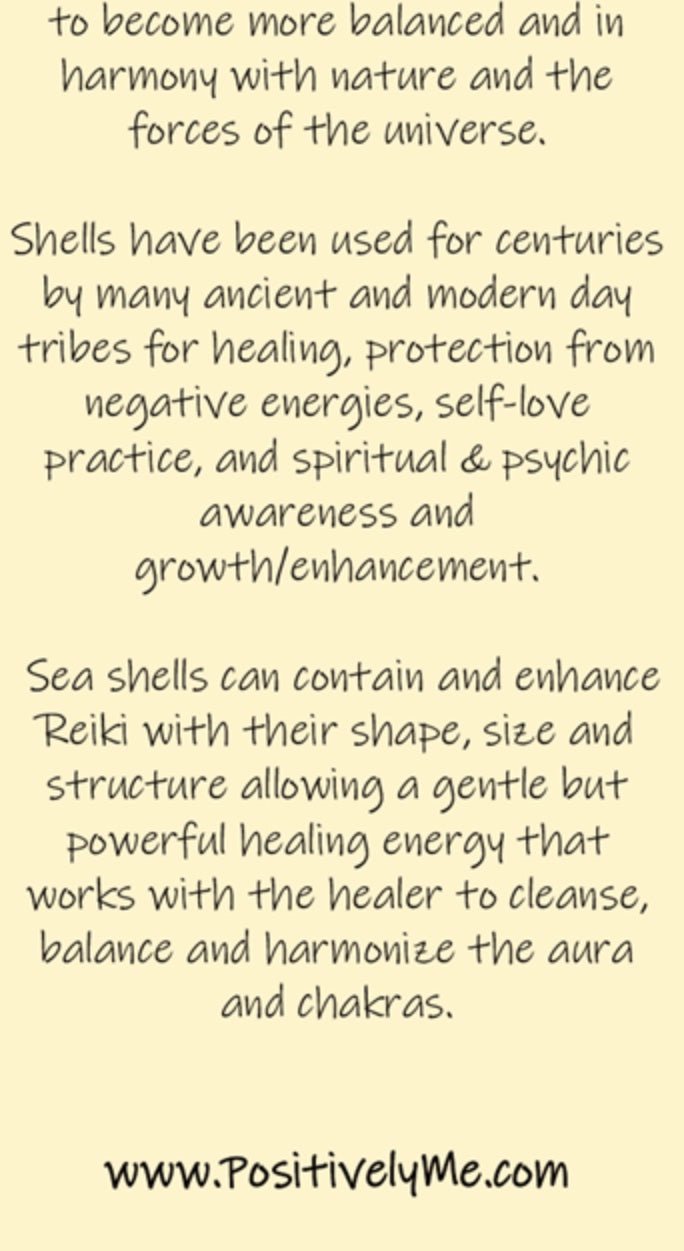 Sea shells can contain and enhance Reiki with their shape, size and structure allowing a gentle but powerful healing energy that works with the healer to cleanse, balance and harmonize the aura and chakras.