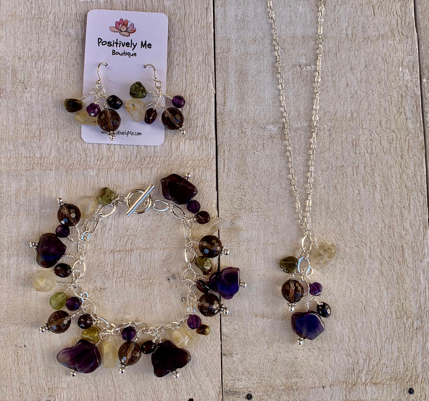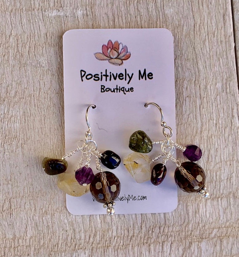 Find inner peace with our gorgeous free form Amethyst, faceted Smoky Quartz , Garnet, Citrine and Jade Earrings! Hand wired gemstones strung on Sterling Silver Earring Wires. Exclusively designed and handcrafted by Positively Me Boutique.