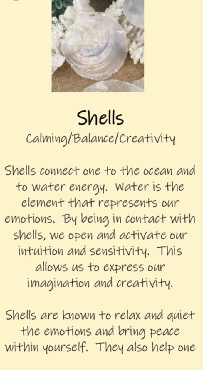 Shells are known to relax and quiet the emotions and bring peace within yourself. They also help one to become more balanced with nature and the forces of the universe.