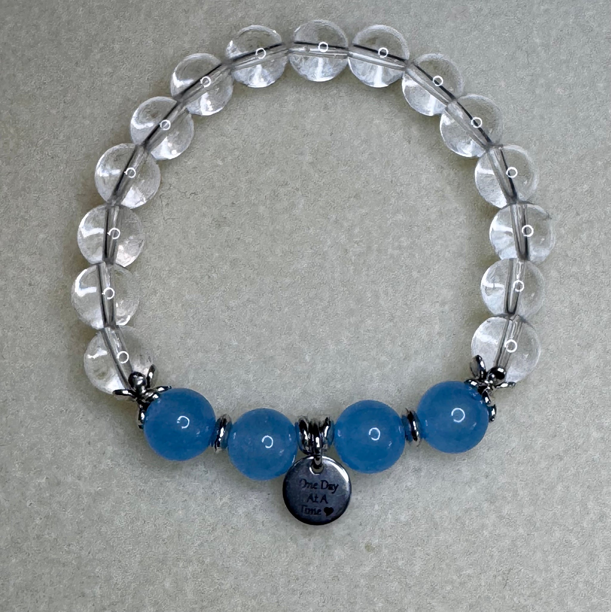Embrace balance, clarity, and mindful strength with this One Day at a Time sterling silver charm bracelet. Designed to inspire calm and focus, it features genuine Fluorite and Clear Quartz...