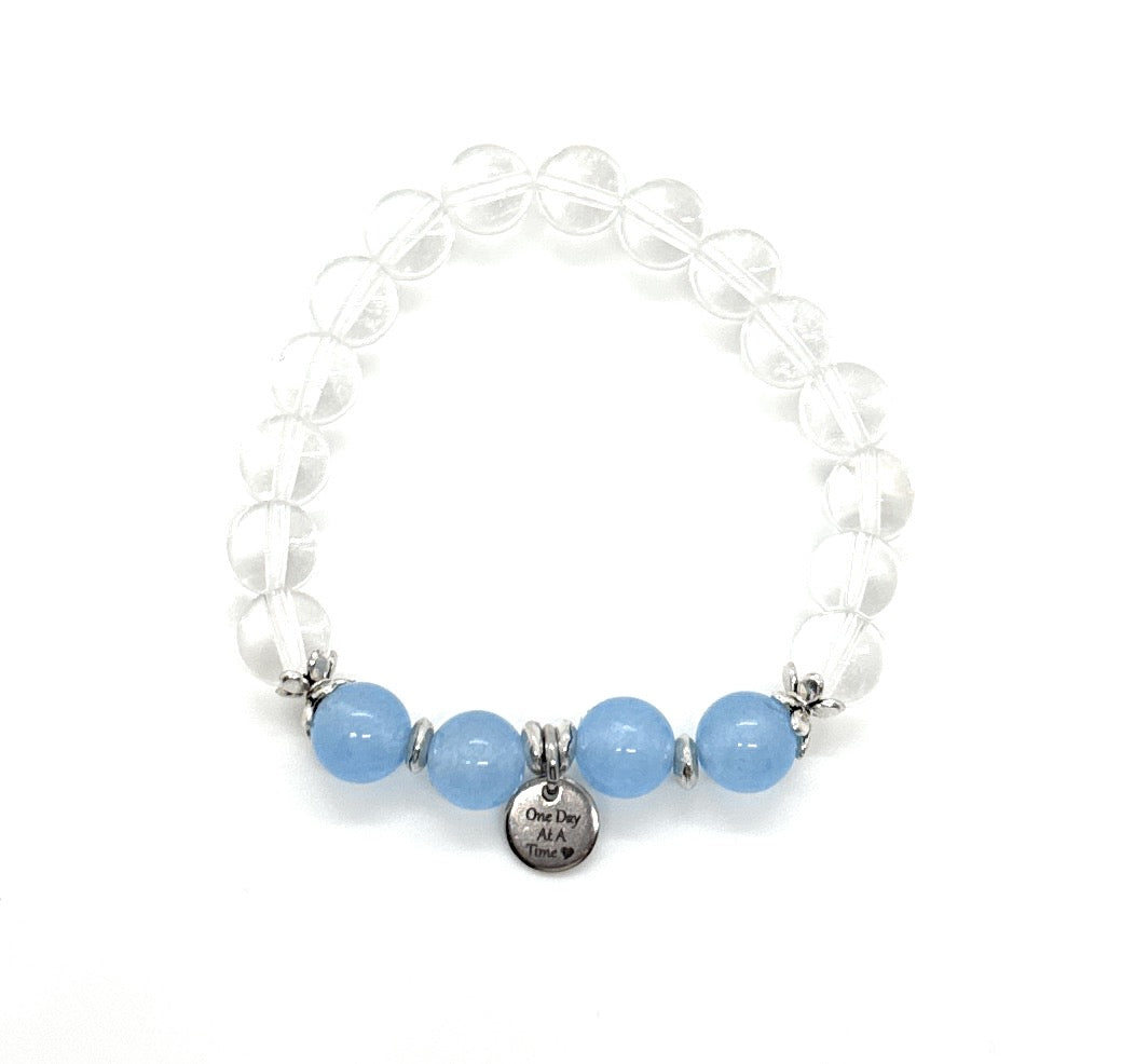 Embrace balance, clarity, and mindful strength with this One Day at a Time sterling silver charm bracelet. Designed to inspire calm and focus, it features genuine Fluorite and Clear Quartz gemstone beads — each chosen for their powerful, supportive energies.