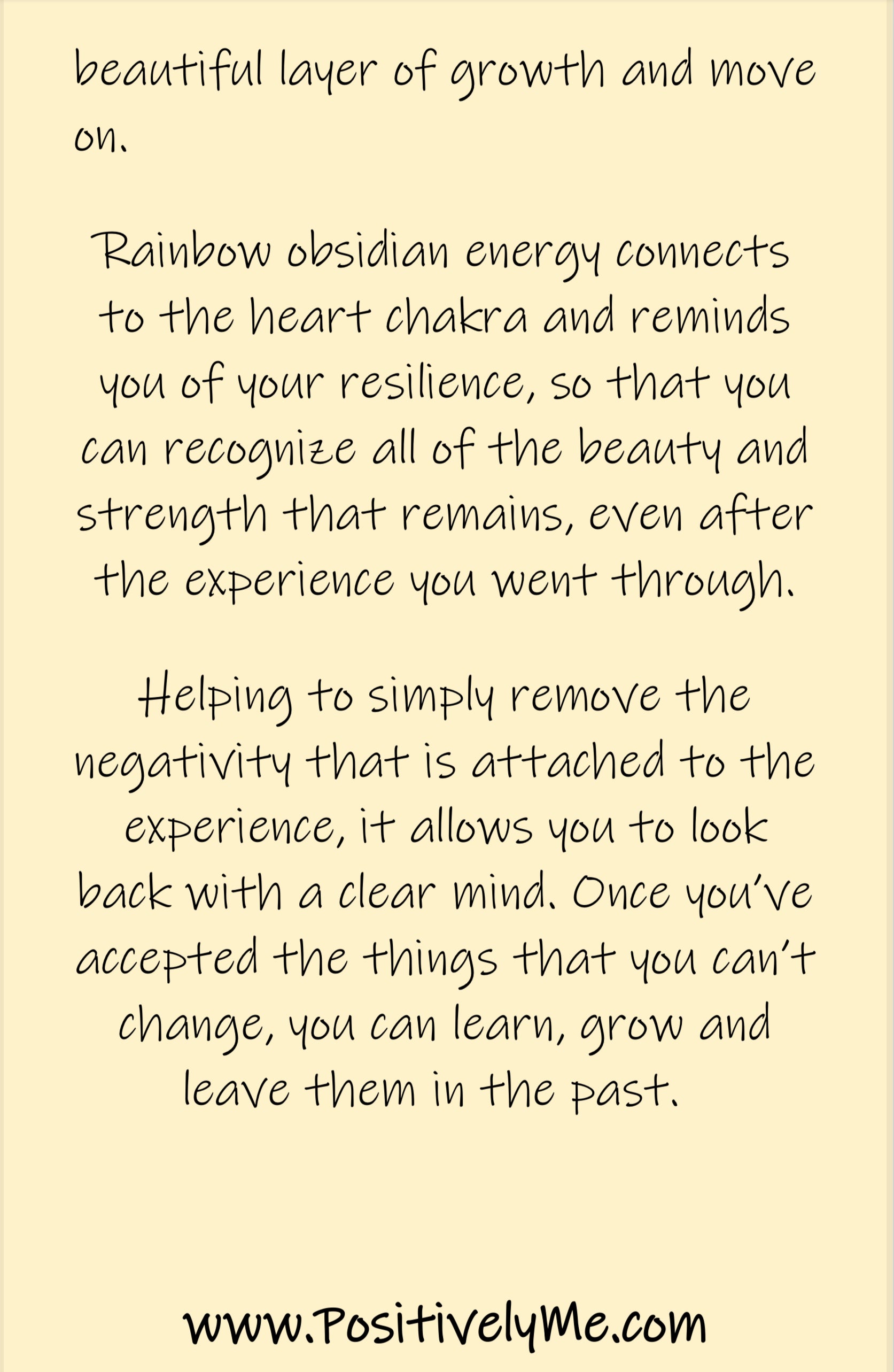 Rainbow obsidian energy connects to the heart chakra to help you remove toxic ties. There’s nothing quite like a loss or a break up to make you feel like you’re made of glass. Rainbow obsidian reminds you of your resilience, so that you can recognize all of the beauty and strength that remains, even after the experience you went through. Helping to simply remove the negativity that is attached to the experience, rainbow obsidian allows you to look back with a clear mind. Instead of examining things through the lens of heartbreak, reflect with the energy of compassion and understanding that rainbow obsidian lends you. Once you’ve accepted the things that you can’t change, you can learn, grow and leave them in the past.