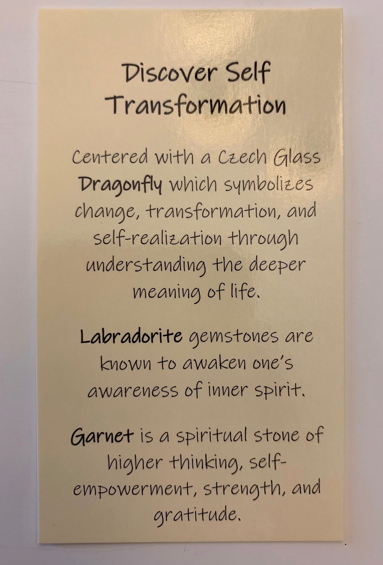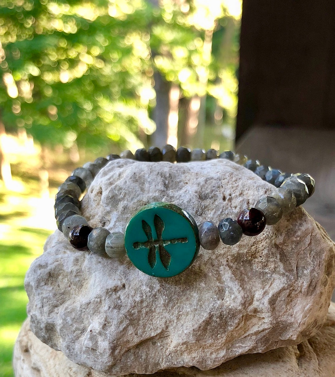 Discover Self Transformation with our beautiful bracelet centered with a dragonfly czech glass handpainted bead and surrounded by Labradorite and Garnet gemstones. Exclusively designed and handcrafted by Positively Me Boutique.