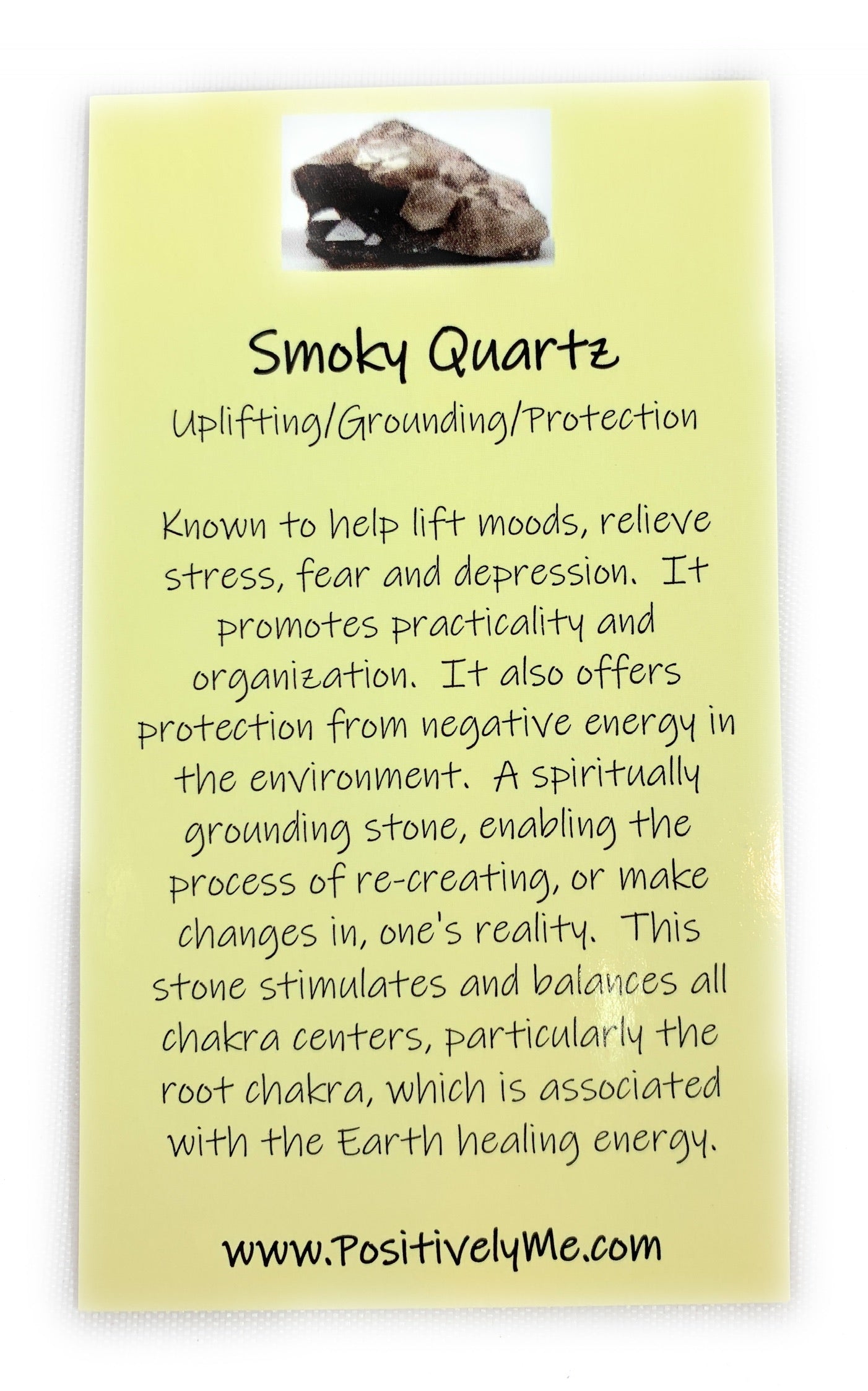 Smoky Quartz is known to help lift moods, relieve stress, fear and depression. It promotes practicality and organization. It also offers protection from negative energy in the environment. A spiritually grounding stone, enabling the process of re-creating, or make changes in, one's reality. This stone stimulates and balances all chakra centers, particularly the root chakra, which is associated with the healing energy of the Earth.